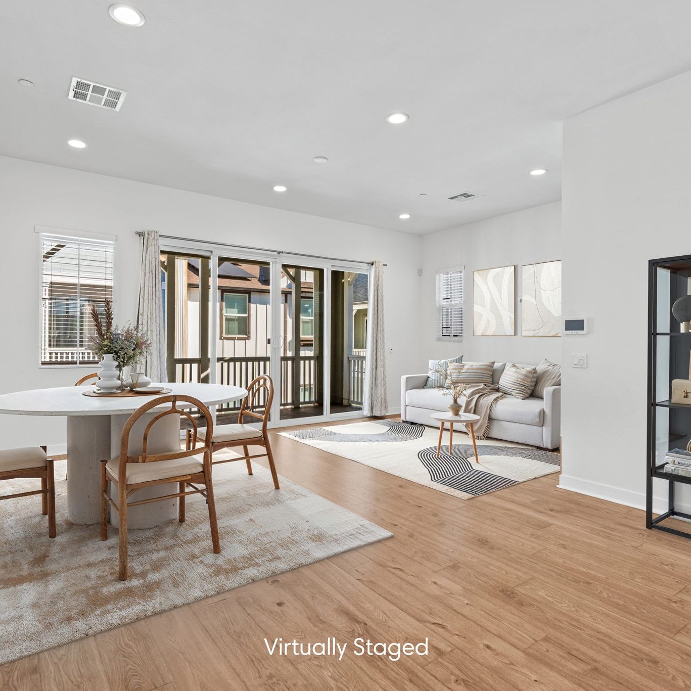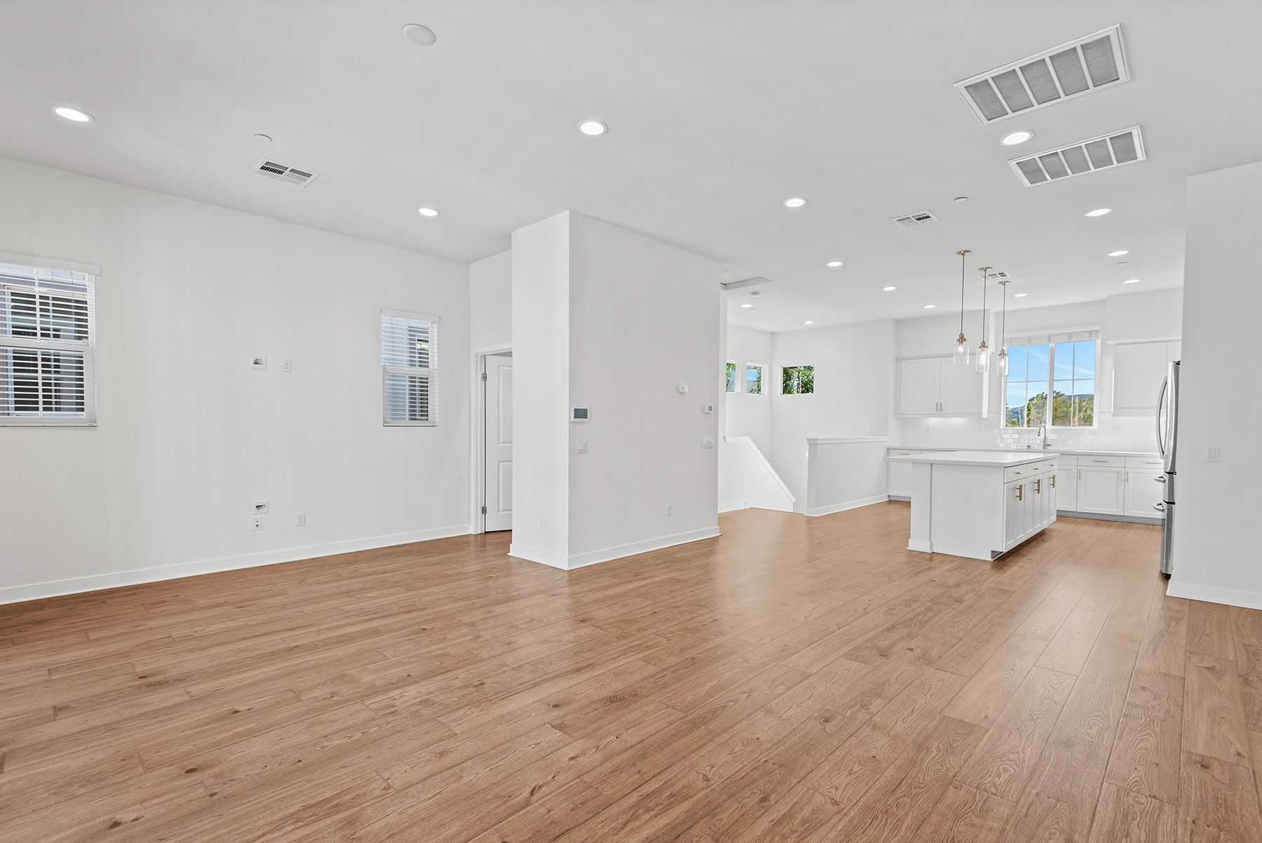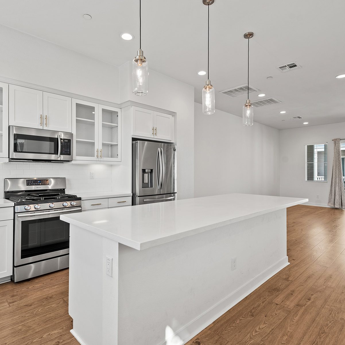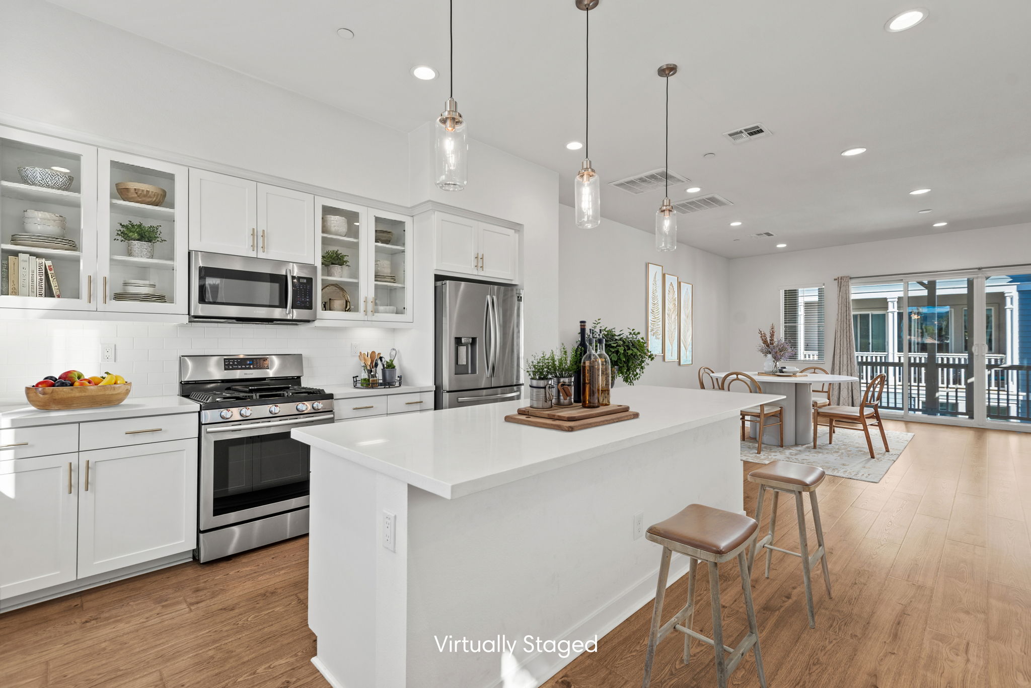 The main entry, via a private walkway, features high ceilings and natural light. The entry-level 4th bedroom suite offers privacy with an en-suite bath, walk-in closet, and side-yard access—ideal for guests, an office, or a gym. The second level houses the primary retreat with a dual-vanity en-suite and walk-in closet, two additional well-sized bedrooms served by a full dual-vanity bath with a soaking tub, and a separate laundry room with plenty of storage. The third floor is an open-concept living space with a gourmet kitchen and it features solid wood cabinets, stainless steel appliances, Quartz countertops, and a large island. Additionally a walk-in pantry, dining area, powder room, and spacious living room complete the modern floor plan. Sliding glass doors open the living room to a large, private covered patio, perfect for relaxing or BBQs. Additional features include: direct-entry 2-car garage, central air/heat, dual pane windows, paid-off solar panels, tankless water heater, and ceiling fans.